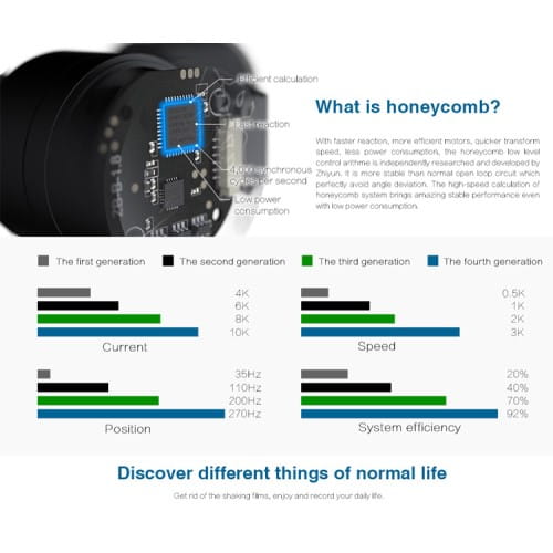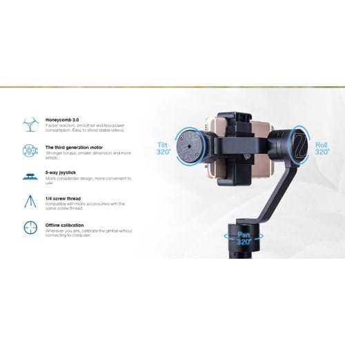 Smooth C+ to trzyosiowy gimbal dedykowany do współpracy ze smartfonami. Jest kompatybilny ze wszystkimi modelami telefonów o przekątnej nie większej niż 7 cali. Świetnie stabilizuje obraz podczas nagrywania filmów z ręki. Użytkownik ma do wyboru trzy tryby pracy. Stabilizator wyposażony jest w Honeycomb 3.0 dla szybszej reakcji, płynniejszego ruchu przy jednoczesnym mniejszym zużyciu energii. Na rękojeści znajduje się 5-cio kierunkowy joystick, dzięki któremu można dokonywać korekty pochylenia czy wyzwalać migawkę parując uchwyt z telefonem za pomocą Bluetooth. Gimbał można również przykręcić do statywu (gwint 1/4''). Łatwy i szybki montaż telefonu zapewnia wytrzymała klamra, w której można umieścić nie tylko iPhone 7 ale dowolny smartfon o przekątnej nie większej niż 7 cali.