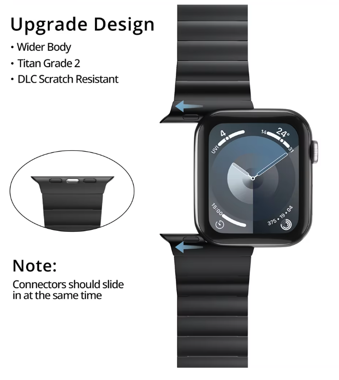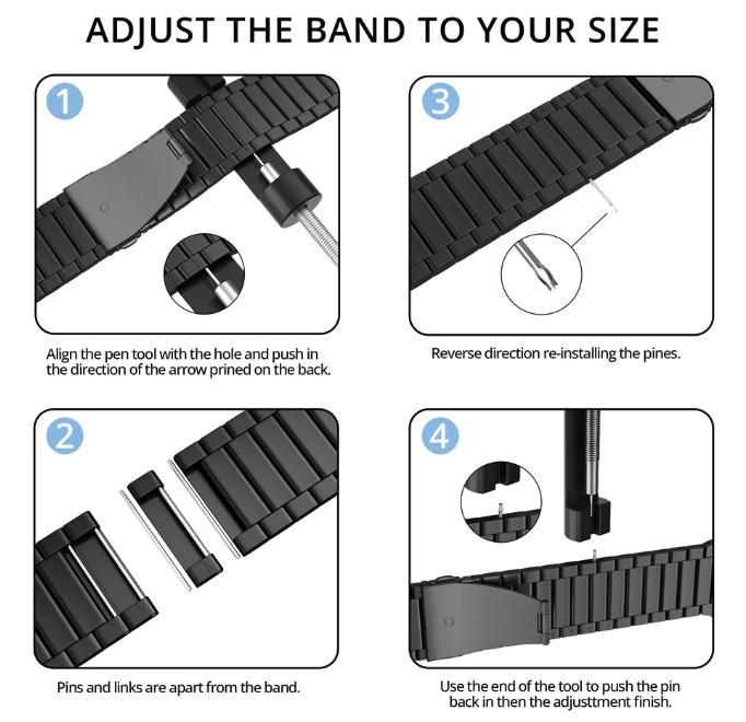 - Regulacja rozmiaru - dostosowując 4 mikrootwory, uzyskasz bardziej precyzyjny rozmiar nadgarstka. 8szt linków można usunąć za pomocą dostarczonego narzędzia