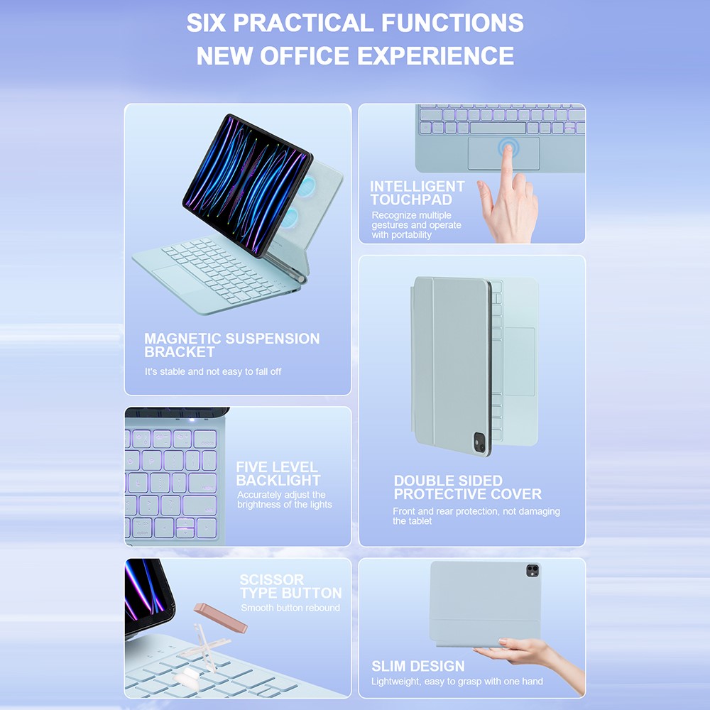 Ten innowacyjny dodatek łączy w sobie inteligentny touchpad, responsywną klawiaturę oraz ochronny stojak w jednym smukłym pakiecie. Bez wysiłku przekształć swój tablet w pełnoprawne stanowisko robocze: otwórz go, aby używać jako stabilny stojak do prezentacji lub wideorozmów, pisz szybko na klawiaturze po włączeniu i zamknij, aby bezpiecznie chronić urządzenie w podróży.