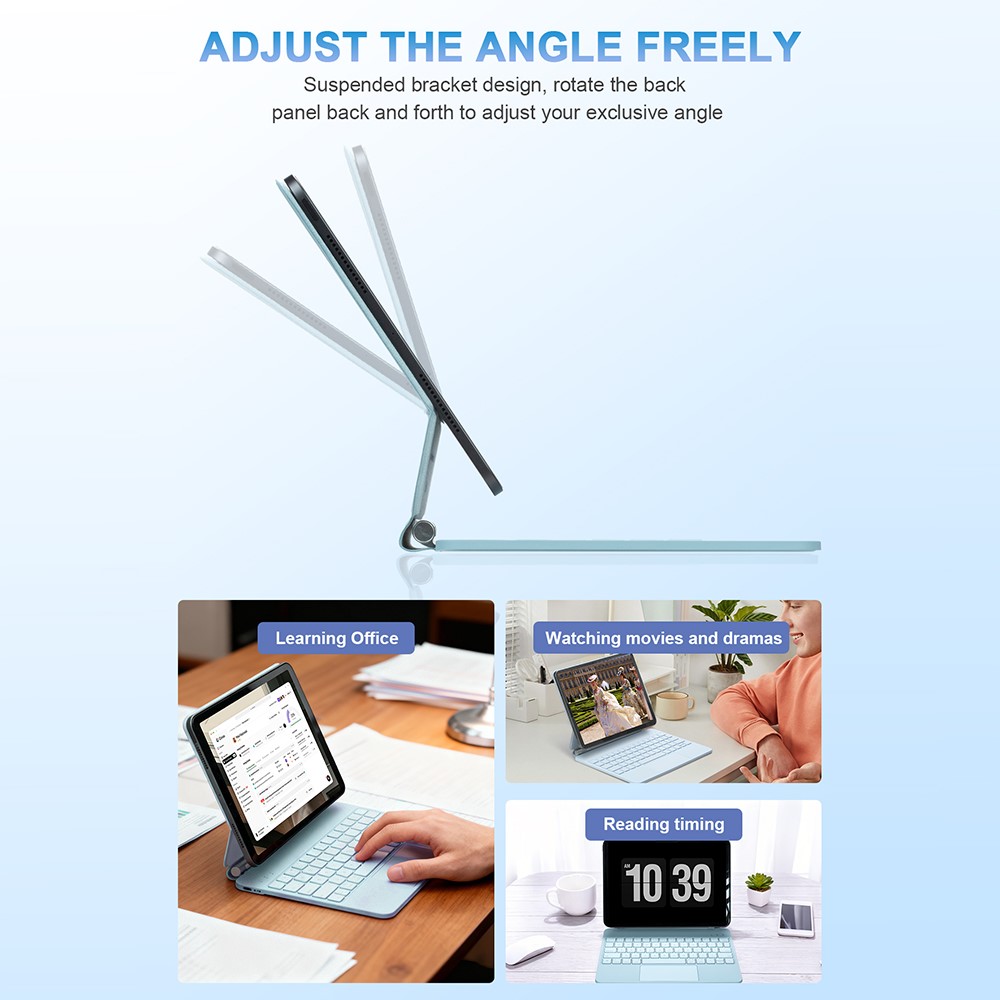 Odkryj wygodę wszechstronności dzięki projektowi zawieszanego stojaka. Obracaj tylną ściankę z łatwością, aby uzyskać idealny kąt widzenia do każdej aktywności—czy to nauki, pracy, oglądania filmów, czy czytania ulubionych e-booków. Dostosuj swoje doświadczenie do swoich unikalnych potrzeb.