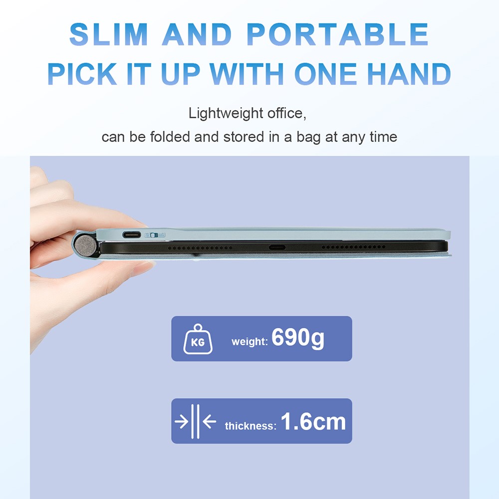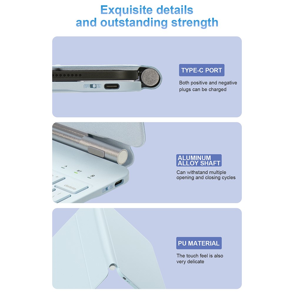 Stworzona z myślą o długowieczności, klawiatura została zaprojektowana z portem Type-C, który wspiera ładowanie odwracalne. Aluminowe zawiasy wytrzymują wielokrotne użycie, a gładkie wykończenie z PU zapewnia komfort i styl, czyniąc ją idealnym towarzyszem dla mobilnych profesjonalistów i studentów.