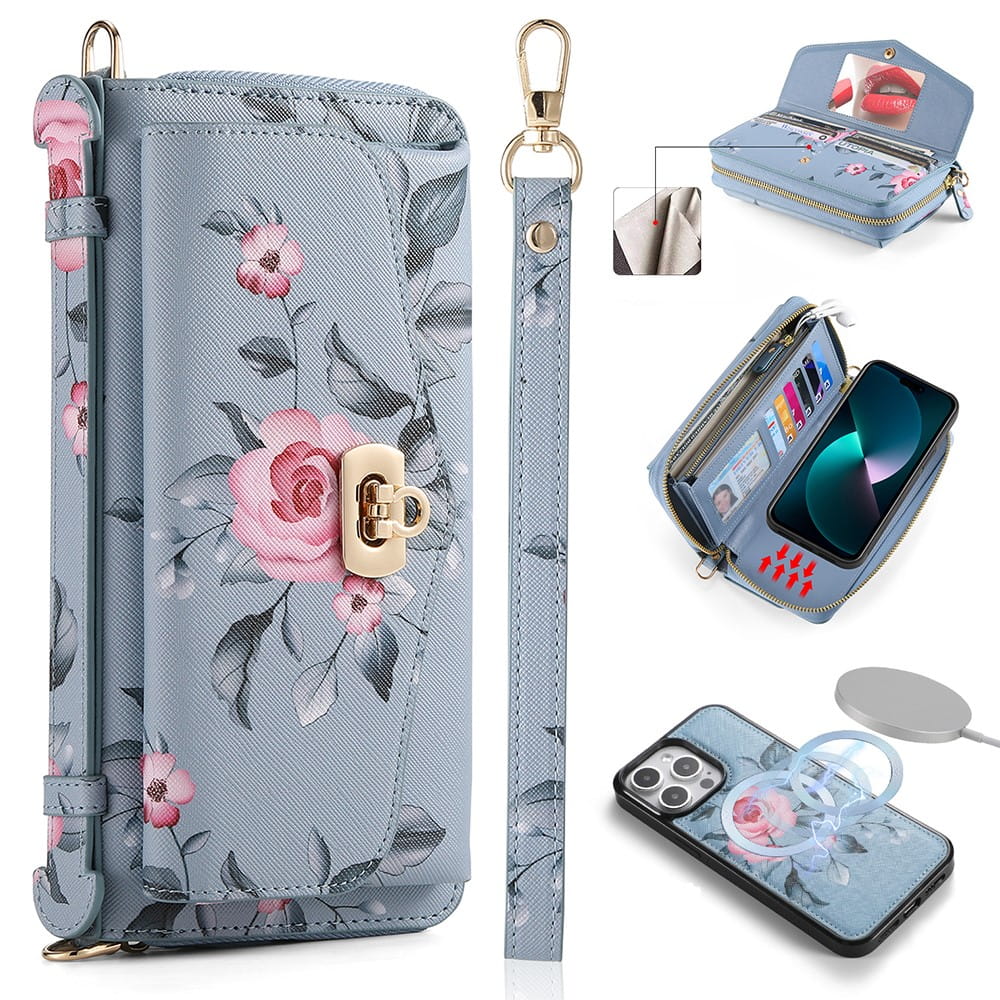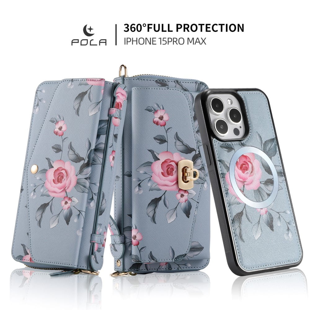 POLA Etui Portfel Pokrowiec do iPhone 15 niebieskie w kwiaty