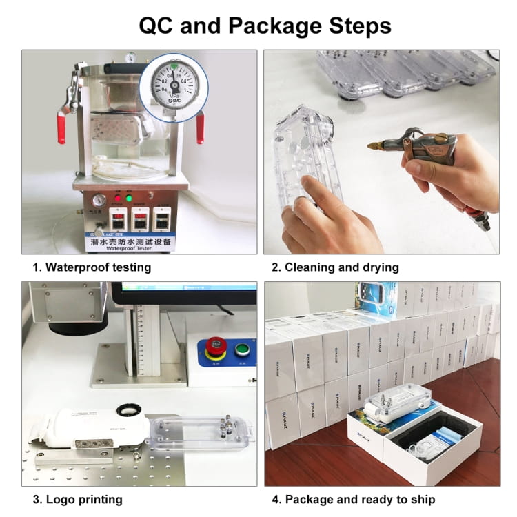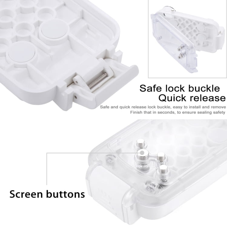 - Przed użyciem należy sprawdzić obudowę. Włóż kilka chusteczek zamiast telefonu do wodoodpornego etui i zamknij obudowę, a następnie włóż etui na 15 cm na 10 minut, aby sprawdzić, czy obudowa jest w pełni szczelna.
