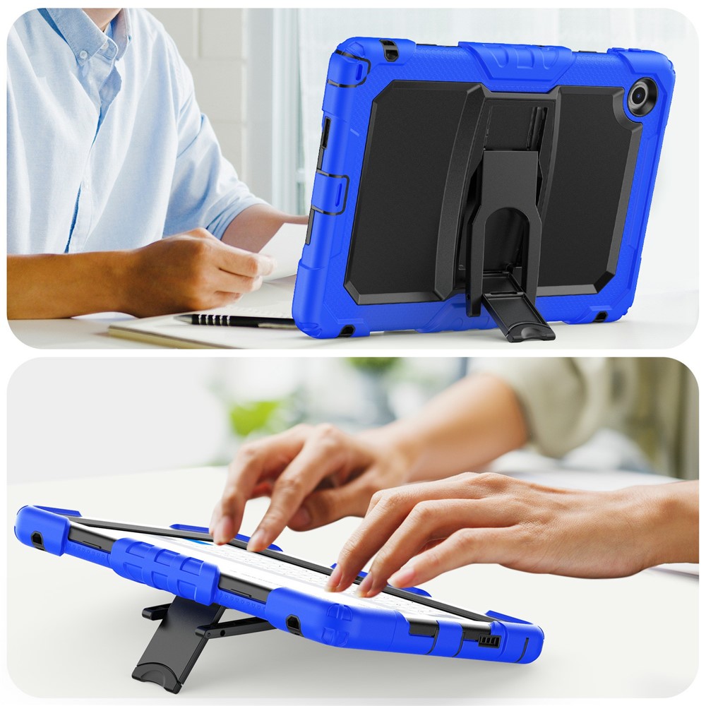 Granatowe etui do Lenovo Tab 10.1" 2025 TB-311XU / TB-311FU łączy twardą obudowę PC z miękkim silikonem, oferując kompleksową ochronę przed upadkami i zarysowaniami oraz wygodę użytkowania dzięki wbudowanemu stojakowi i regulowanemu paskowi na ramię. Smukła, antypoślizgowa konstrukcja zapewnia pewny chwyt, a praktyczne wycięcia umożliwiają pełen dostęp do portów i aparatów — idealne rozwiązanie dla uczniów, podróżujących i pracujących mobilnie.
